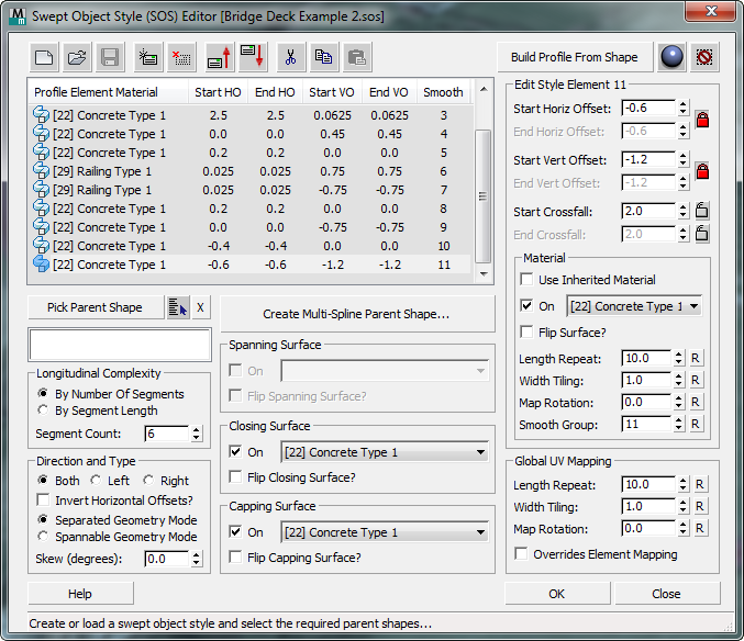 A swept object definition can be saved to a text-based Swept Object Style (SOS). Each style contains a set of elements. Each element represents a single surface within the swept object. Each element features adjustable (and variable) horizontal and vertical offsets and an independent material channel definition. By default, swept objects use the CivilViewSurfaces material.