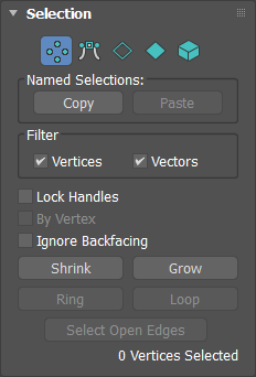 The Selection rollout provides buttons for selecting the sub-object level, working with named selections, display and filter settings, and displays information about selected entities.