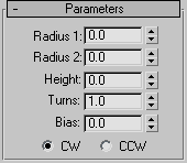 Creates a Helix spline from the keyboard. Use the X/Y/Z settings to specify the center point, and the remaining parameters to specify the radii and height, then click Create. After creating the spline, you can use the Parameters rollout controls to adjust its settings (see following).