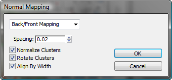 The Normal Mapping method of procedural mapping applies planar maps based on different vector-projection methods to texture polygons. It is the most straightforward method, but can result in even greater texture distortion than with the Flatten Mapping dialog. The Normal Mapping dialog lets you control how clusters are defined and mapped.