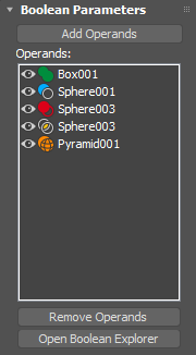 - Displays the operands of the compound object. Colored icons show the current Boolean operation as shown in the Operand Parameters rollout. Visibility of each operand can be toggled on and off by clicking the eye icon.