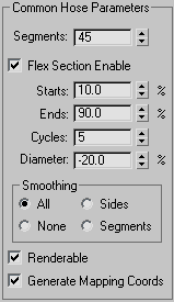 When on, lets you set the following four parameters for the central, flexible section of the hose. When off, the hose's diameter is uniform throughout its length.