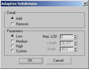 These settings determine the extent to which detail is added or removed. The Length and Angle settings are available for editing only when the Custom option is chosen. However, they show the default settings for the Low, Medium, and High options.