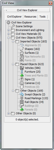 - The Civil View Objects Branch provides a categorized list of objects that have been created in Civil View. The number of objects currently present in each object category is indicated in brackets after the main category label.