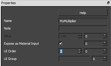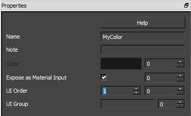 - Change the Name field to MyColor, change the UI Order number to 1, and turn on Expose As Material Input.