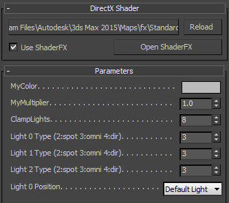 - Exit the group view, then minimize the ShaderFX editor. The MyColor and MyMultiplier attributes are now available in the Parameters rollout.