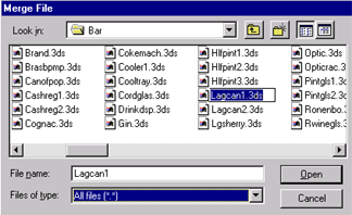 Use File menu Import to bring objects from other programs into a scene. The types of files that you can import are listed in the Files Of Type list in the Select File To Import dialog.