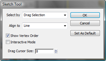 • Drag Selection Lets you pick multiple vertices by dragging. When you click OK, the mouse cursor appears as a circle. After you drag to select vertices, release the mouse button, and then drag (or Alt+click) to sketch. As with Pick Selection, the mouse cursor continues to alternate between Select and Sketch modes until you right-click to exit.