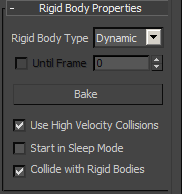 Tip: A rigid body need not be animated to take advantage of this feature. For example, you might want to suspend several stationary bodies and then drop them at different times. To do so, simply set them all to Kinematic and turn on Until Frame, then select each one in turn and specify the frame at which it should start being subject to gravity and/or other forces. - Bake/Unbake