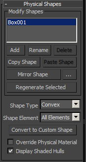 - Shows all the physical shapes that comprise the rigid body. Highlight a physical shape in the list to rename it, delete it, copy and paste it, change its mesh parameters or affect its transform via the Mesh Transform sub-object level.
