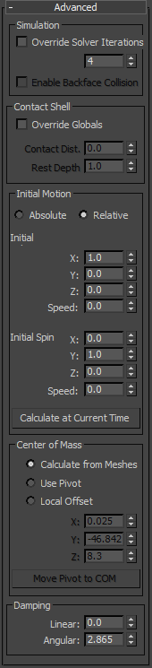 - This setting applies only to rigid bodies that start out Kinematic (typically these are already animated) and then switch to Dynamic at the frame specified by the Until Frame setting on the Rigid Body Properties rollout. Normally, the initial velocity and initial spin of such bodies are calculated based on the animation for the last frame before they become dynamic. When this option is set to Absolute, the values of Initial Velocity and Initial Spin (see following) are substituted for the animation-based values. When set to Relative, the specified values are added to the values calculated from the animation.