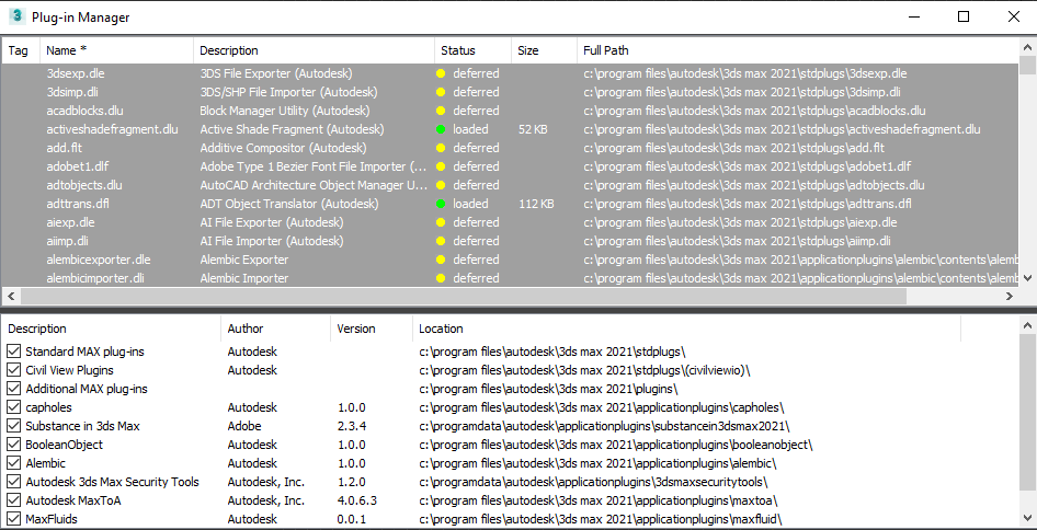 The Plug-in Manager lets you manage plug-ins. The Plug-in Manager provides a list of all plug-ins found in the 3ds Max plug-in directories, including the plug-in description, type (object, helper, modifier, and so on), status (loaded or deferred), size, and path. The Plug-in Manager provides options to load any plug-in, regardless where it resides on disk. Unlike the File Properties dialog, which only lists plug-ins used in a scene, the Plug-in manager lists all loaded plug-ins, and allows you to manage them.