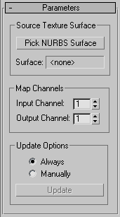 - In the Parameters rollout, turn on Pick NURBS Surface, and then click the NURBS projection surface in a viewport.