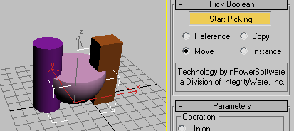 - Click this and then click each operand to transfer to the Boolean object in turn. Before picking each operand, you can change the Reference/Copy/Move/Instance choice, the Operation options, and the Apply Material choice.