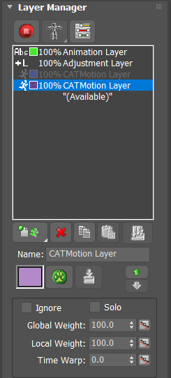 The Layer Manager rollout is available for every bone in a CATRig. To access it, select any bone in the rig and go to the Motion panel.