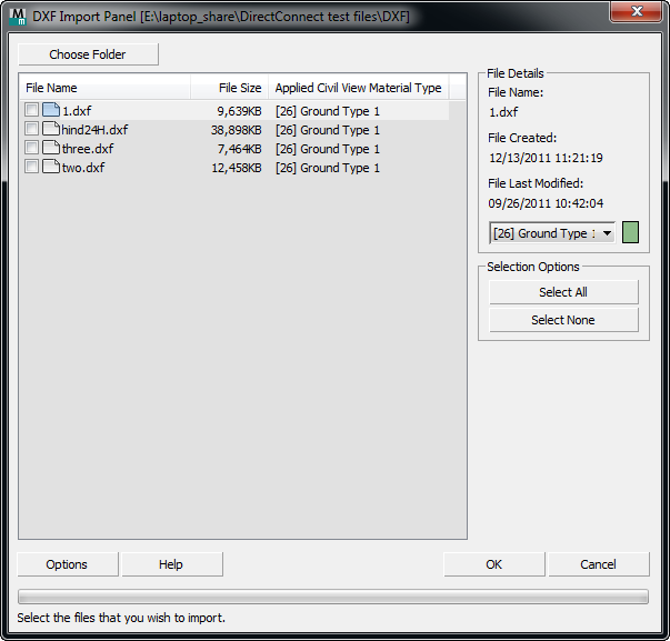 - Lists all DXF files in the active directory. Also shows the size of each file in kilobytes, and the CivilViewSurfaces material channel associated with each file (see below).
