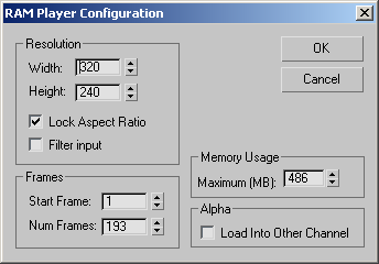 The RAM Player Configuration dialog contains controls for resolution, frames, memory usage, and alpha channel for playing back animations.
