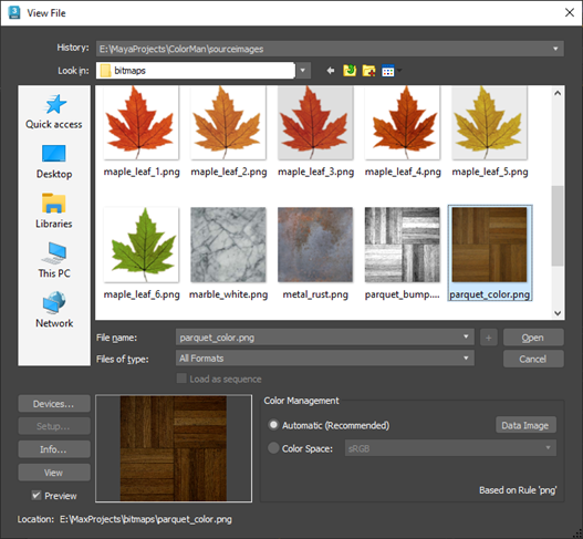 - Sets the Color Space to Raw. Use this for files that contain non-color data, such as normal maps, weight maps, and so on.