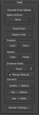 This rollout provides tools for accomplishing a variety of tasks with Hair, including creating a hairstyle from an existing spline object, resetting the hair, and loading and saving general presets for the modifier as well as specific hairdos. Here you can also specify an object from the current scene to be used as hair, such as a flower or group of flowers for creating a garden.