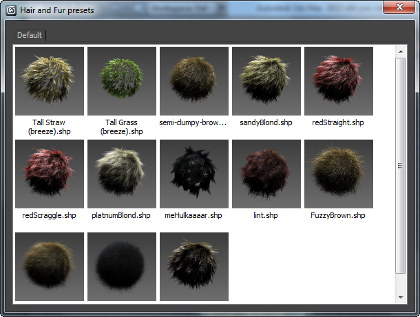 Opens the Hair Presets dialog, which contains a list of presets in the form of named swatches. To load a preset, double-click its swatch. Several sample presets are included with 3ds Max.