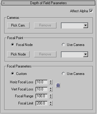 - Custom Uses the values set in the Focal Parameters group to determine the properties of the Depth of Field effect.