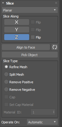The Slice modifier slices through groups, selected objects or sub-object selections of faces. It works similarly to the Editable mesh Edge