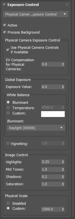 This control is a duplicate of the one found under Rendering menu > Environment > Environment and Effects dialog. For more information, see Physical Camera Exposure Control