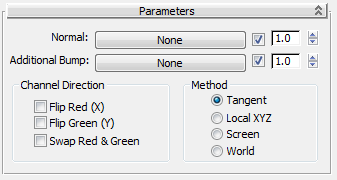 By default, the Normals map's red channel indicates left (larger values) versus right (smaller values), while green indicates down (larger values) versus up (smaller values), and blue indicates vertical distance. The controls in this group let you adjust that interpretation.