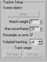 The Camera Tracker utility's Motion Trackers rollout sets up and controls the image feature trackers. All the trackers created are listed here: showing enable check mark, tracker number, associated scene point object name, and active frame range. To select a tracker, click in the list. Provides controls for subpixel tracking as well.