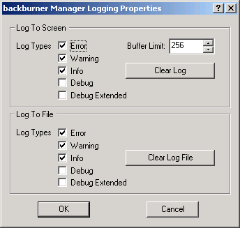 The Log To Screen options determine which types of messages are displayed in the list window of the Manager or Server window.