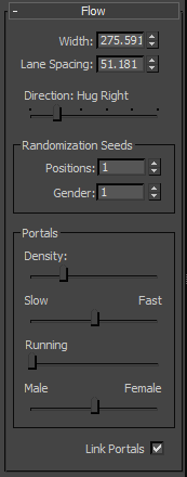 In Populate, a flow is a pathway along which simulated people walk or run. Visible features include lines that show lanes where people walk and markers that show each pedestrian's starting point, direction of travel, and gender: red for female and blue for male. Markers also appear at lane and ramp endpoints.