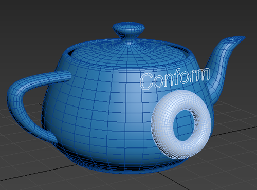 In this example, the conform object (torus) is projected onto the target object (teapot).