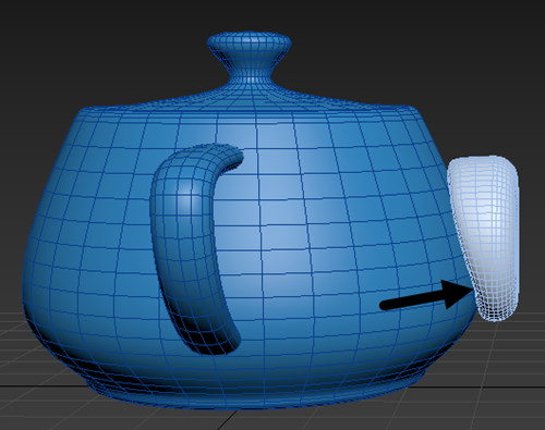 In the following image, the arrow highlights the bottom of Torus001, which is conformed to the curvature of the teapot. However, the top of the torus is not fully conformed. - In the