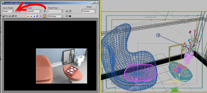 Renders a rectangular region within the active viewport. Using this option leaves the remainder of the Rendered Frame Window intact except when rendering an animation, in which case it clears the window first. Use the Region option when you need to test-render a part of the scene.