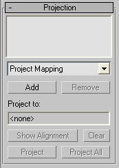 Lets you choose a projector plug-in. Only one projector, Project Mapping, is provided with 3ds Max. See Project Mapping Rollout (Projection Modifier). Additional projectors might be available from third-party sources.