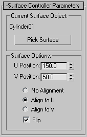 - Adjusts the position of the controlled object along the U coordinates of the surface object.