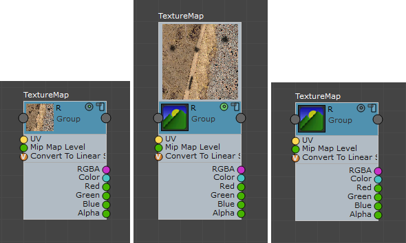 Click the Render Swatch icon on the top of each node to cycle through displaying: its icon, its small render swatch, and its large render swatch.