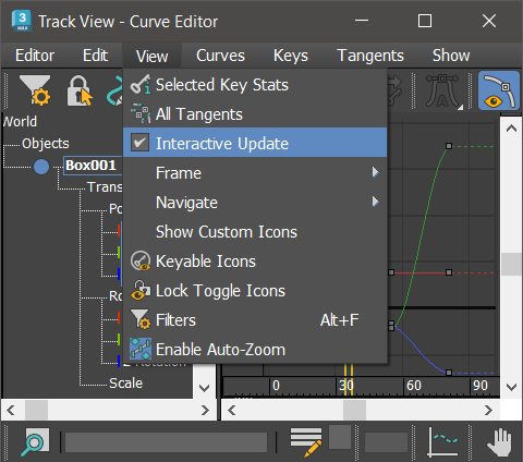 Note:In some circumstances, simply playing back an animation or dragging the time slider with Track View open without editing keys can cause performance issues. If you experience this, and Interactive Update is on, turn it off to improve playback performance.