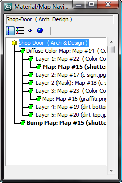 - Displays the materials and maps in list format. Blue spheres are materials. Green parallelograms are maps. The green parallelograms turn red if Show Map in Viewport is on for a material.