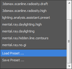 In addition to the default presets that ship with 3ds Max, you can create your own. At the bottom of the Preset list, two choices let you use and create your own custom presets: