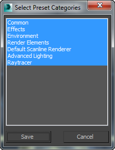 Attention: Although you assign the renderer on the Common panel of the Render Setup dialog, the renderer assignment is not among the Common category settings in the RPS file. Instead, each preset has a separate category for the current renderer assignment. For example, if the current renderer is the Default Scanline Renderer, the Select Preset Categories dialog will have a category labeled Default Scanline Renderer. - Save Preset
