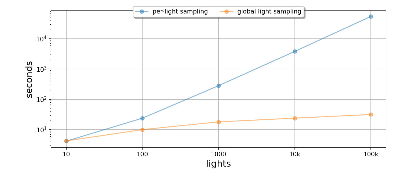 For equal-quality renders of this scene, the new light sampling technique becomes progressively faster than per-light sampling as more lights are used. |