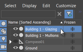 3ds Max applies the glazing material to the glazing. In the Scene Materials section of the Browser panel, now you can see a Glass entry, and the object name.