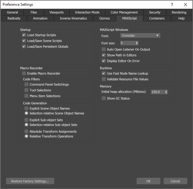 On the MAXScript panel of the Preference Settings dialog, you set MAXScript and Macro Recorder preferences, enable or disable auto-loading of scripts, set the initial heap size, change font style and size used in the MAXScript editor, and manage all the settings for the Macro Recorder.