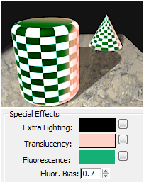 translucent effect. The Translucency color is a non-directional diffuse reflection. The diffuse color on an object depends upon the angle between the surface normal and the position of the light source. By ignoring the surface normal alignment, this color component simulates translucent materials.