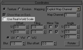 For real-world mapping to work, two requirements must be met. First, the correct style of UV texture coordinates must be assigned to the geometry. Essentially, the size of the UV space needs to correspond to the size of the geometry. An option called Real-World Map Size appears on most of the dialogs and rollouts that let you generate texture coordinates (see list at the end of this topic). Any dialog or rollout that lets you turn on Generate Mapping Coords also lets you enable Real-World Map Size. Also, you can toggle this option globally on the Preferences dialog General panel.