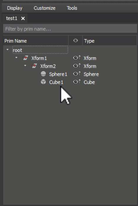 - Ctrl+Click: When applied to a collapsed parent prim, this command fully expands the tree hierarchy to show all descendants. When applied to an expanded parent prim, it collapses the tree hierarchy.