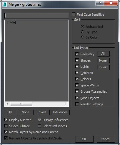Use the Merge File dialog to open the scene file to merge. This opens the Merge dialog, whose controls are similar to those on the Selection Floater.