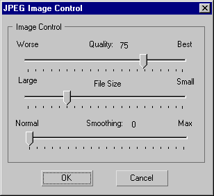 When JPEG is the chosen output format, clicking Render or Setup in the Render Output File dialog displays the JPEG Image Control dialog.