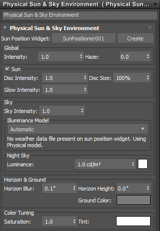 To edit parameters for the installed Physical Sun & Sky environment map: